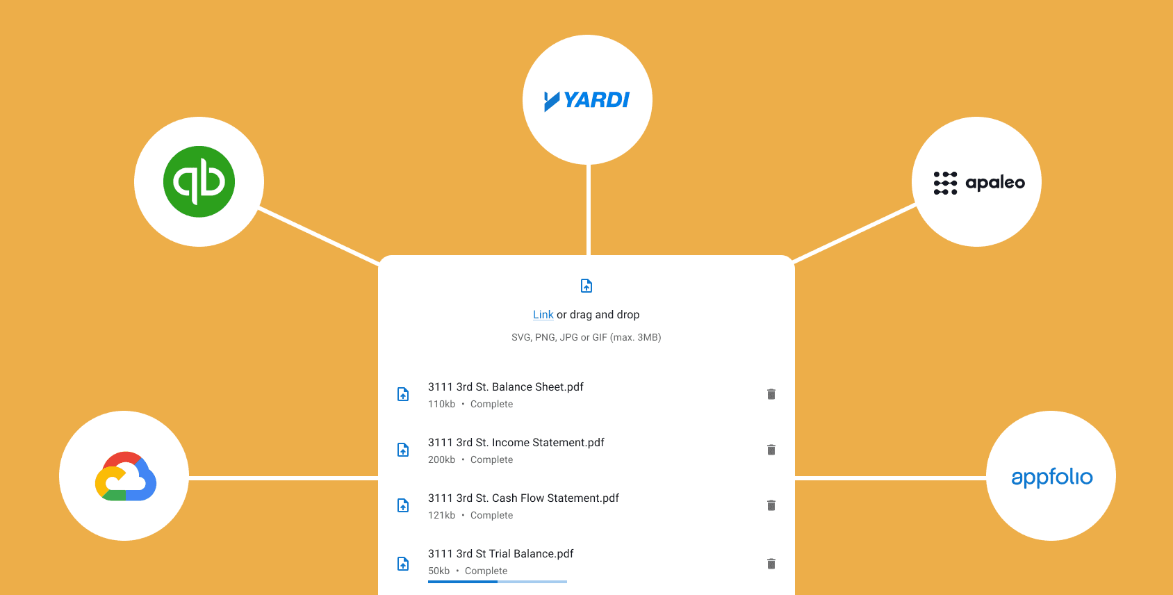 Integrate files in any format and from any source, and export to any system, including Yardi, Appfolio, and MRI.